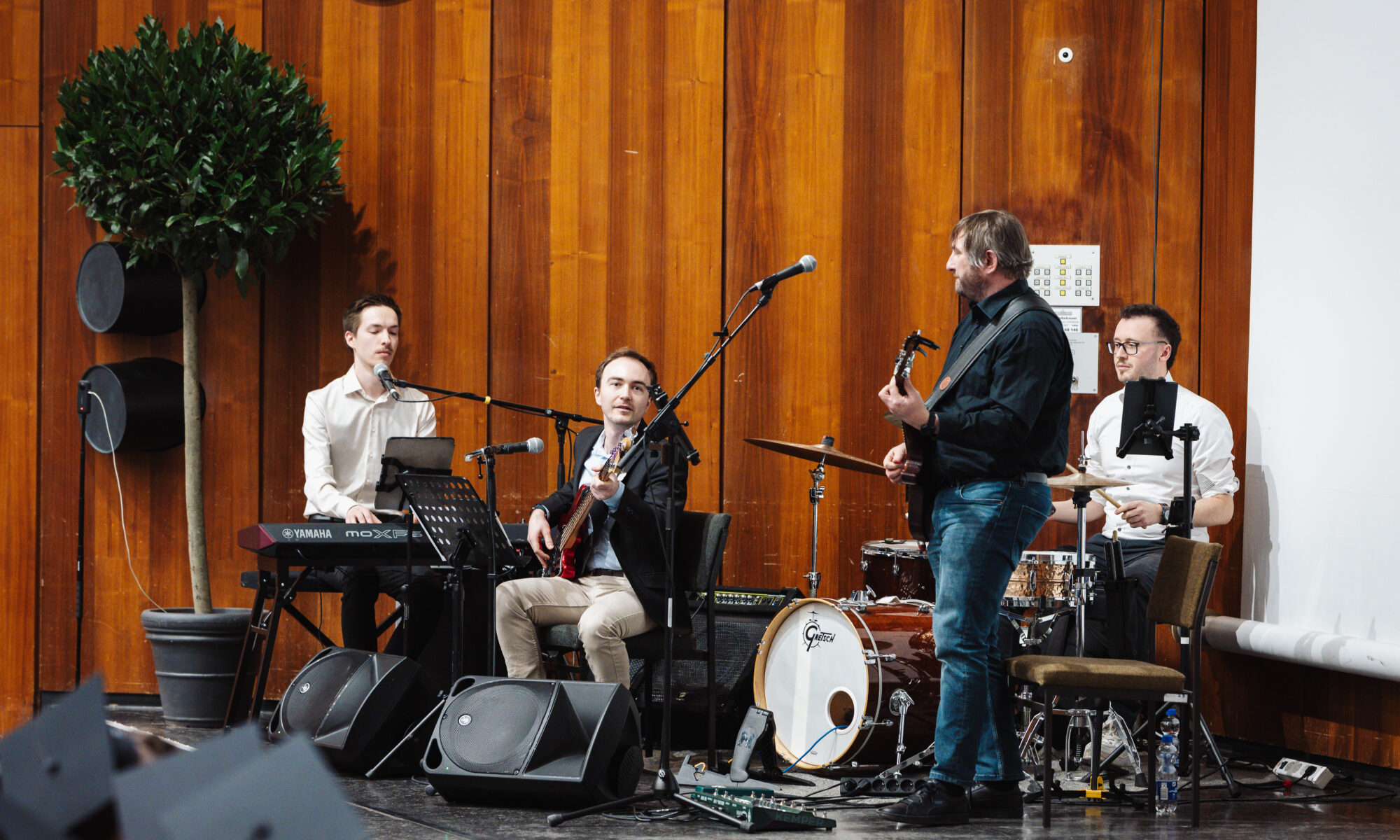 Für die Hochzeitsfeier am 13. Dezember haben wir uns allerdings Verstärkung geholt und so hat uns Lennart Pannek am Gesang ergänzt. Mit wenig Proben hat er professionell abgeliefert, sodass man hätte meinen können, man spiele schon seit Jahren zusammen. Auch an den Drums konnte Marwin Sbosny Wiedermals überzeugen.